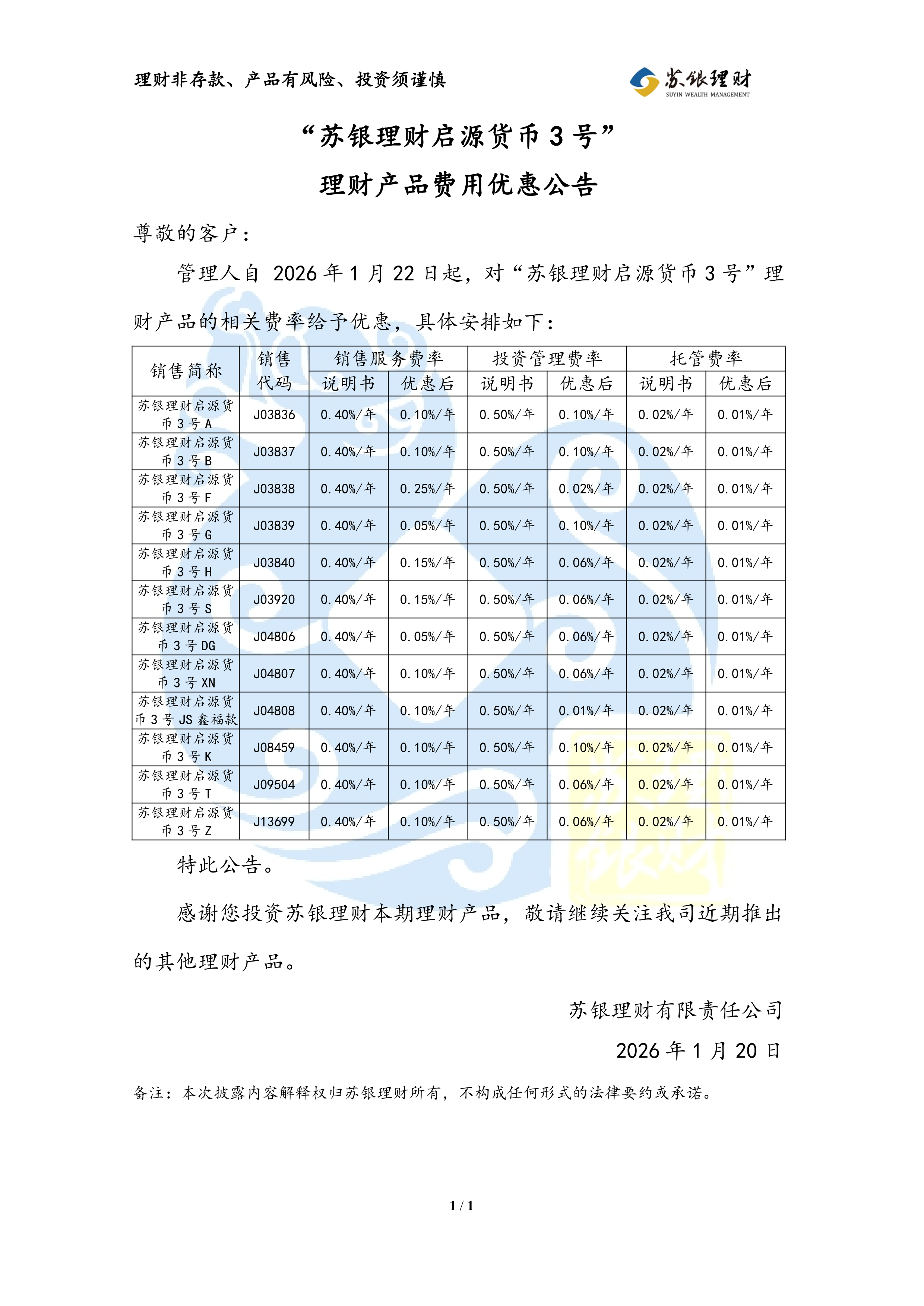 “苏银理财启源货币3号”理财产品费用优惠公告(2026年1月22日执行)