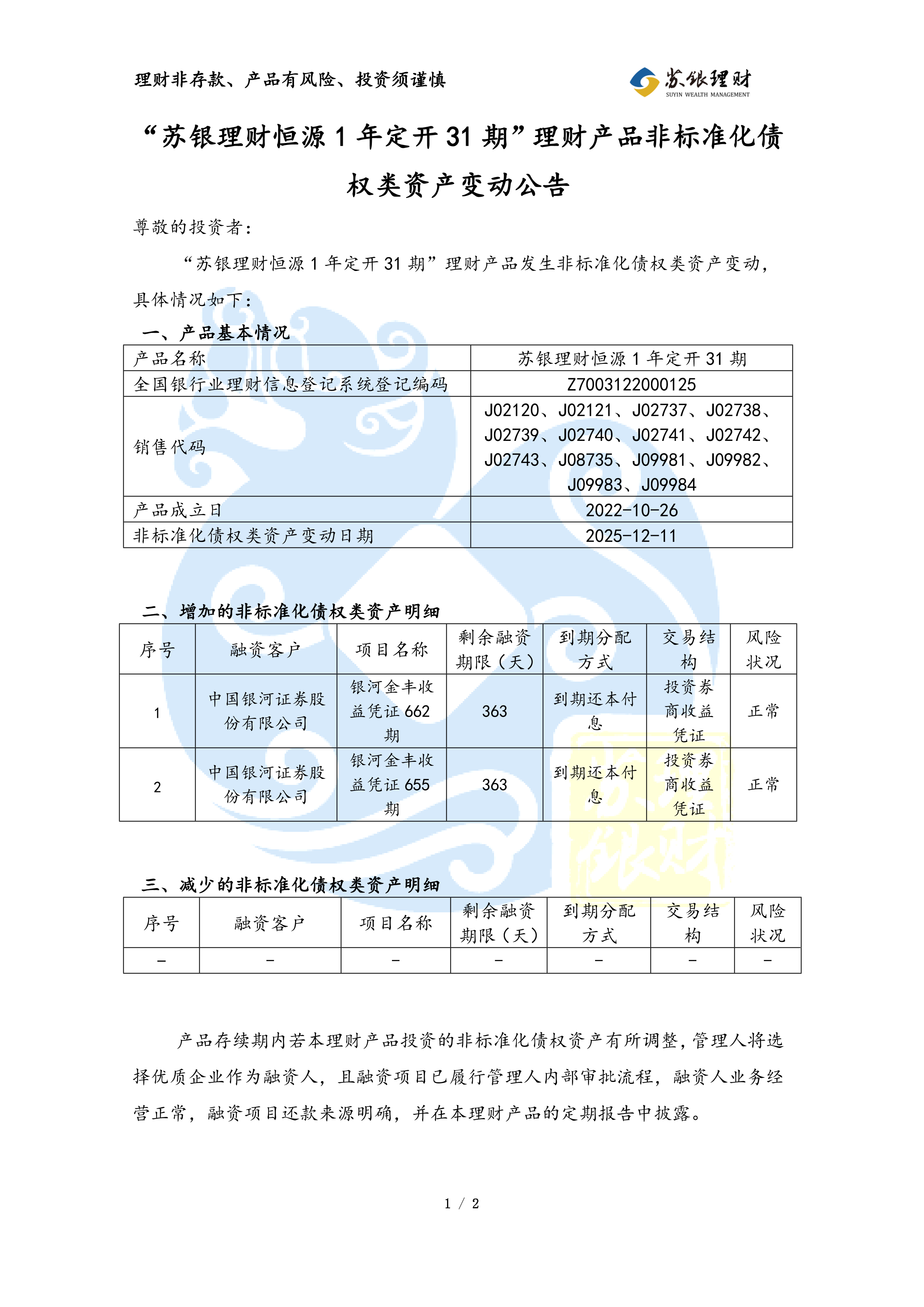 “苏银理财恒源1年定开31期”理财产品非标准化债权类资产变动公告(2025年12月11日)