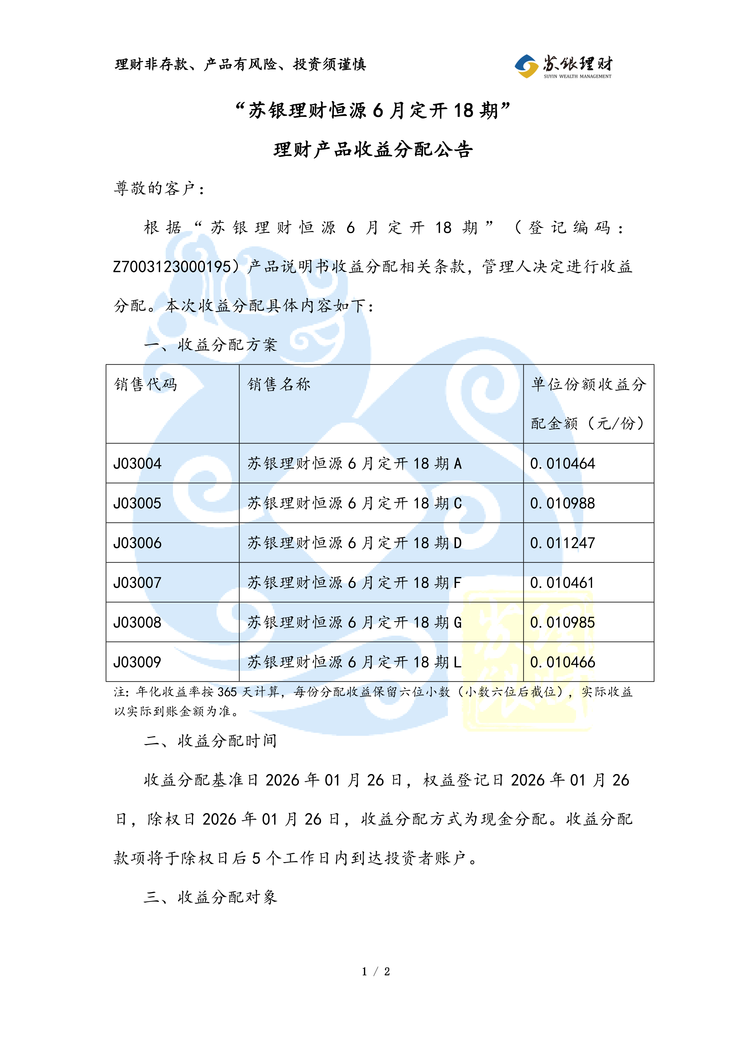 “苏银理财恒源6月定开18期”人民币理财产品收益分配公告(2026年01月27日)