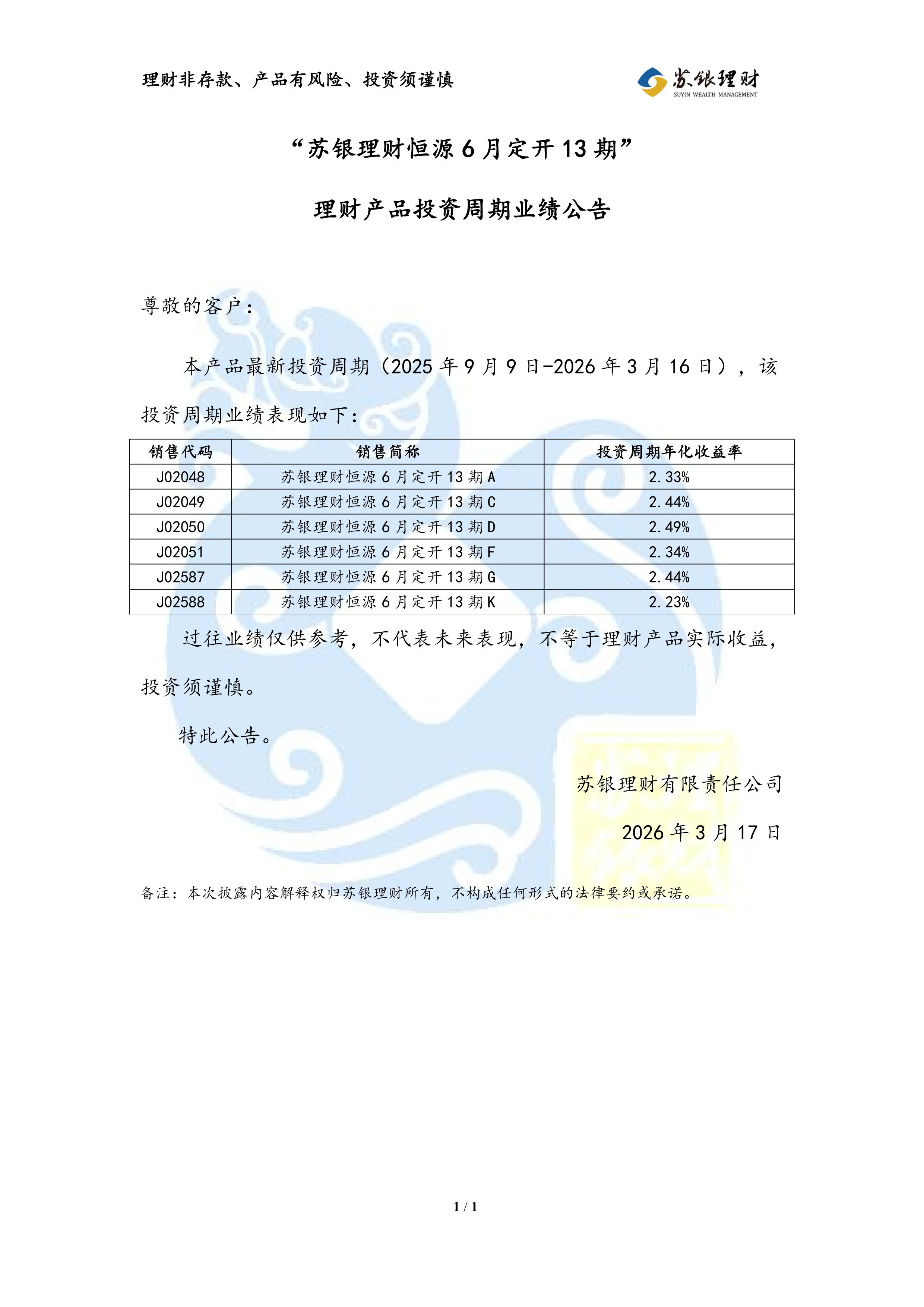 “苏银理财恒源6月定开13期”理财产品投资周期业绩公告(2026年3月17日)