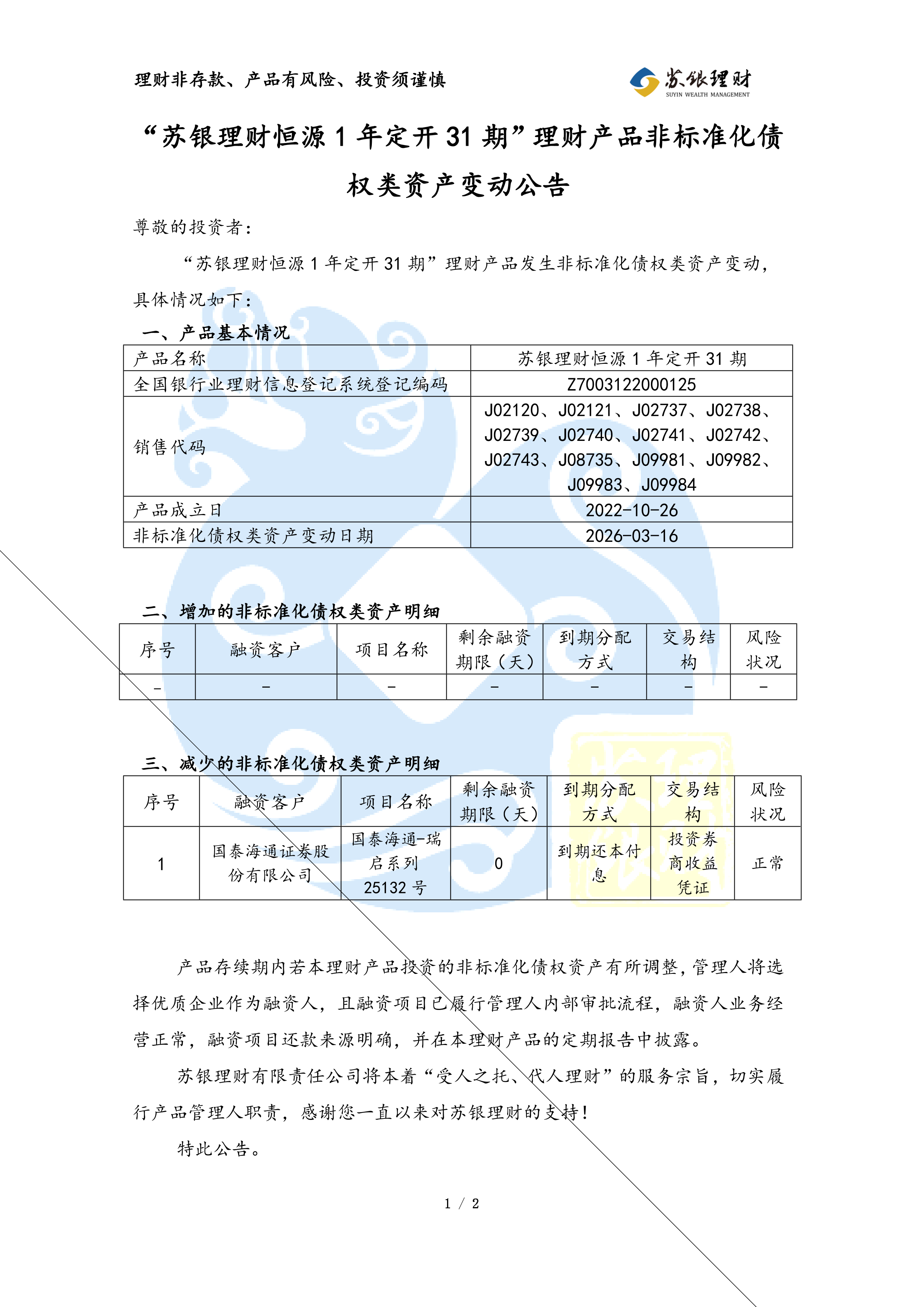 “苏银理财恒源1年定开31期”理财产品非标准化债权类资产变动公告(2026年03月17日)