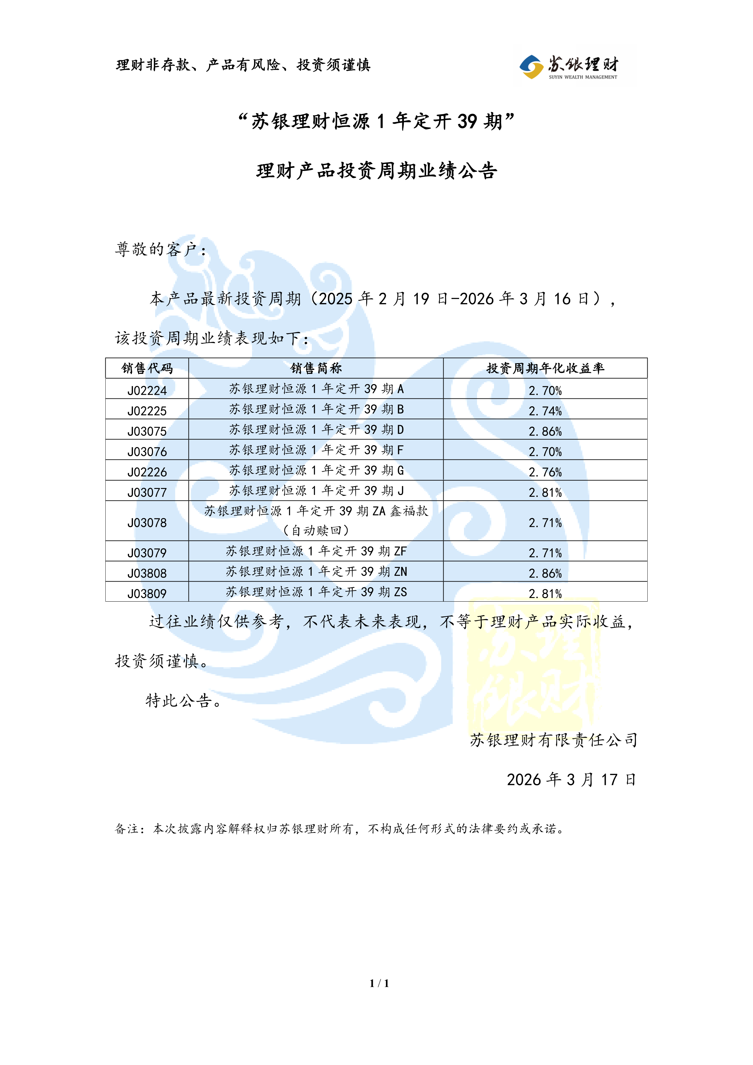 “苏银理财恒源1年定开39期”理财产品投资周期业绩公告(2026年3月17日)